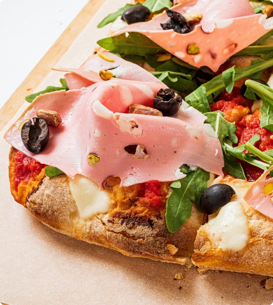 Mozzarella, tomate cherry, queso de cabra, jamón york.
